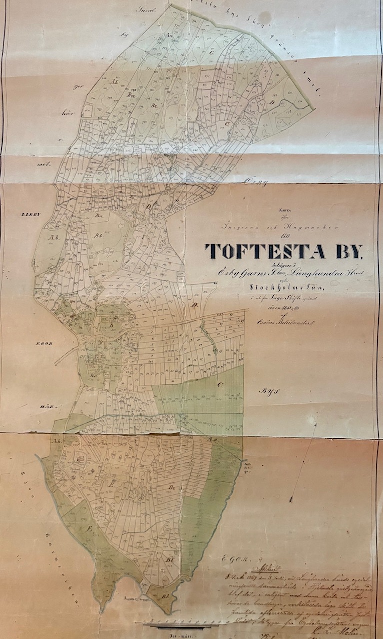 Namnet Toftesta By är ett historiskt namn på området som tidigare var uppdelat i små tegar, precis som det nya området nu kommer att gestalta sig. Kartan till höger visar området 1862 och längst ner ser man bl.a. den dåvarande ångbåtsbryggan vid nuvarande badplatsen. Även Össeby Garns kyrka och bl.a. Klockmästarbostaden syns en bit till vänster i kartan samt det lilla bysamhället runt kyrkan som nu går under namnet Lilla Garn.